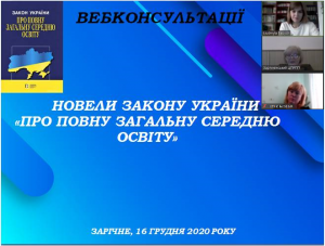 16 грудня 2020 року фахівцями комунальної установи «Зарічненський центр професійного розвитку педагогічних працівників» Зарічненської районної ради Рівненської області під модеруванням директора центру Людмили Володимирівни Бабич було проведено засідання вебконсультацій щодо імплементації Закону України «Про повну загальну середню освіту».