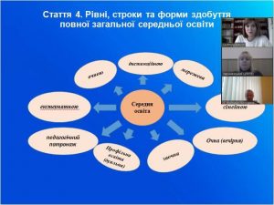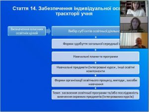 Психолог центру Людмила Бабич ознайомила освітян зі змістом 4 «Рівні, строки та форми здобуття повної загальної середньої освіти» та 10 «Організація освітнього процесу» статей.