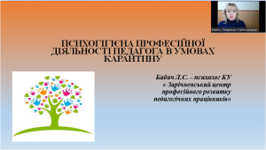 29 січня 2021 року відбувся онлайн-вебінар для працівників психологічної служби з теми «Психогігієна професійної діяльності педагога в умовах карантину», метою якого є підтримка здоров’я та працездатності, надання консультативної допомоги щодо оптимізації режиму праці, відпочинку.